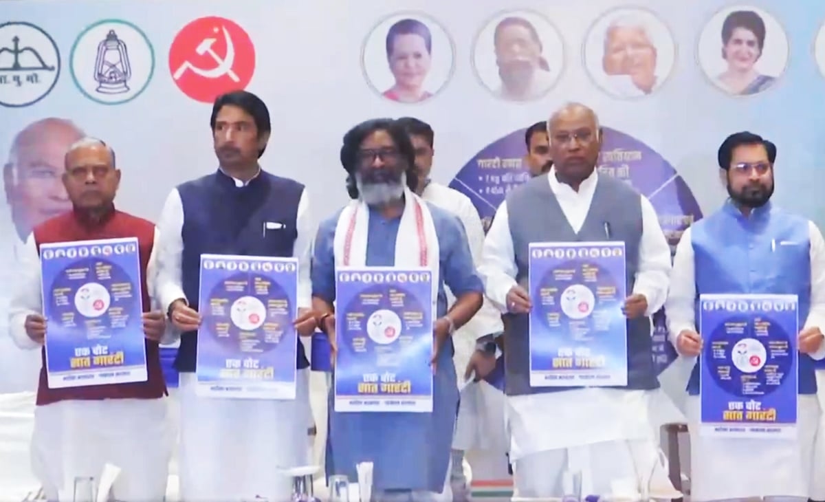 இந்நிலையில், ராஞ்சியில் செவ்வாய்க்கிழமை நடைபெற்ற நிகழ்ச்சியில் இண்டியா கட்சிகளின் 7 வாக்குறுதிகள் அடங்கிய தோ்தல் அறிக்கையை காங்கிரஸின் தேசிய தலைவா் மல்லிகாா்ஜுன காா்கே, ராஷ்ட்ரீய ஜனதா தளத்தின் ஜே.பி. யாதவ் ஆகியோருடன் இணைந்து முதல்வா் ஹேமந்த் சோரன் கூட்டாக வெளியிட்டாா்.