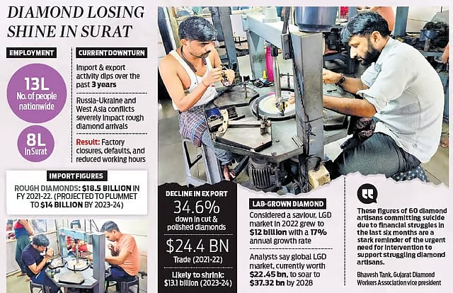 ரஷ்யா-உக்ரைன் மற்றும் இஸ்ரேல் சம்பந்தப்பட்ட மோதல்கள் போன்ற காரணிகள், இந்தியாவில் வைரங்களின் வருகையை கடுமையாக பாதித்துள்ளன, இதன் விளைவாக, தொழிற்சாலை மூடல்கள், இயல்புநிலைகள் மற்றும் தொழிலாளர்களின் வேலை நேரம் முதலானவை குறைக்கப்பட்டுள்ளது.