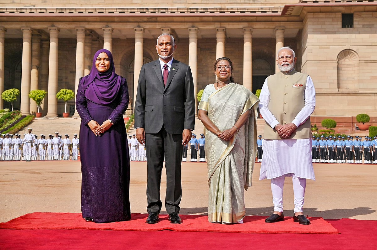 குடியரசுத் தலைவர் திரெளபதி முர்மு, பிரதமர் நரேந்திர மோடியுடன் மாலத்தீவு அதிபா் முகமது மூயிஸ் மற்றும் அவரது மனைவி சஜிதா முகமது.