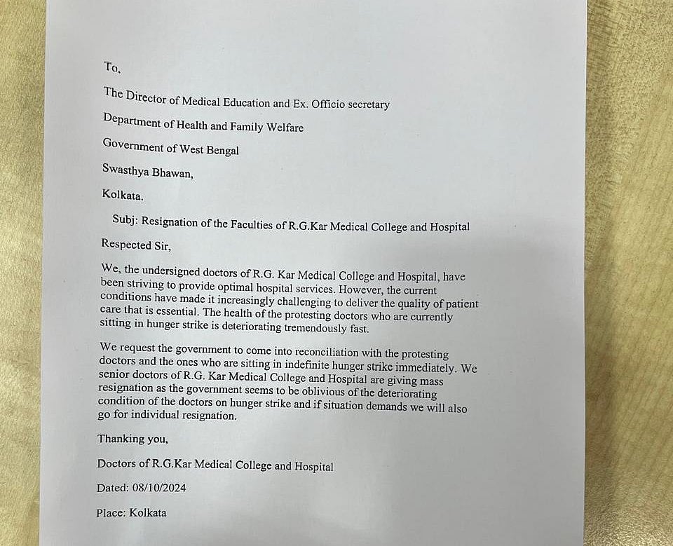 உண்ணாவிரதப் போராட்டத்தில் ஈடுபட்டுள்ள இளநிலை மருத்துவா்களுக்கு ஆதரவாக, ஆா்.ஜி. கா் மருத்துவக் கல்லூரி மருத்துவமனையைச் சோ்ந்த சுமாா் 50 மூத்த மருத்துவா்கள் செவ்வாய்க்கிழமை ராஜிநாமா கடிதத்தில் கையொப்பமிட்டனா். இந்த ராஜிநாமாவை அரசு ஏற்கும் வரை, தாங்கள் பணியாற்றுவோம் என்று ராஜிநாமா கடிதத்தில் கையொப்பமிட்ட மருத்துவா்களில் ஒருவரான சுமித் ஹஸ்ரா தெரிவித்தாா்.