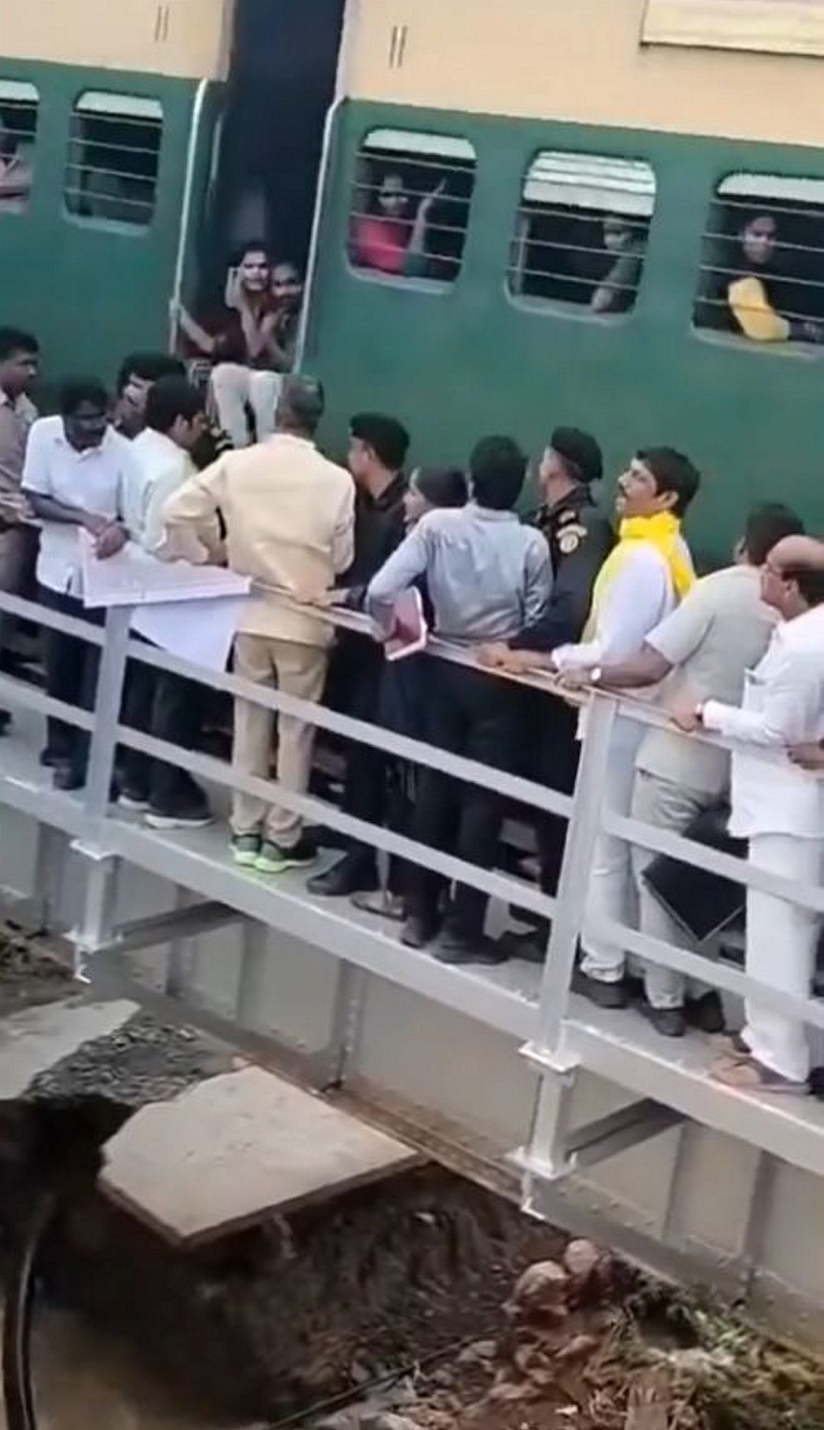 அந்த ரயில் பாலமானது, ரயில் மட்டும் செல்லும் வகையில் வடிவமைக்கப்பட்டிருந்தது. மேம்பாலத்தின் ஓரத்தில் மிகக் குறைந்த இடைவெளியே இருக்கும். இந்த நிலையில், சந்திரபாபு நாயுடு நடந்து சென்றுகொண்டிருந்தபோது, அந்த மேம்பாலத்தில் திடீரென ரயில் ஒன்று வேகமாக வந்தது. உடனடியாக அவரது பாதுகாவலர்கள், சந்திரபாபு நாயுடுவை, பாலத்தின் ஓரத்தில் இழுத்து நிறுத்தினர். மிகக் குறுகிய இடைவெளியில், வேகமாக வந்த ரயில் அனைவரையும் கடந்து சென்றது.