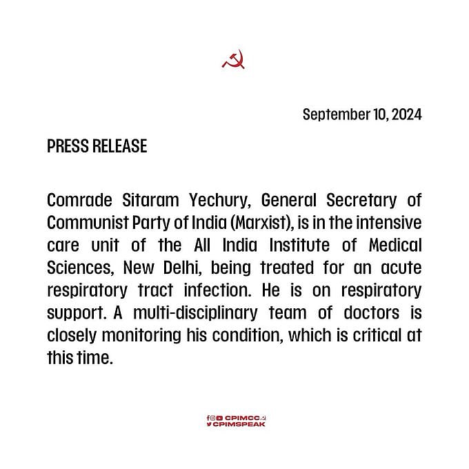 தில்லி எய்ம்ஸ் மருத்துவமனையில் செயற்கை சுவாசக் கருவி உதவியுடன் சீதாராம் யெச்சூரிக்கு தீவிர சிகிச்சை அளிக்கப்பட்டு வருவதாக மார்க்சிஸ்ட் கம்யூனிஸ்ட் கட்சி செவ்வாய்க்கிழமை தெரிவித்துள்ளது.