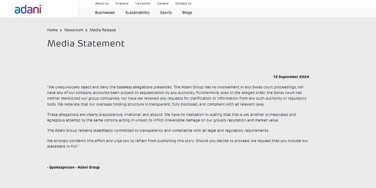 இருப்பினும், ஹிண்டன்பர்க்கின் இந்த குற்றச்சாட்டை அதானி குழுமம் தொடர்ந்து மறுத்து வருகிறது. இந்த நிலையில், அதானி குழுமத்தின் செய்தித் தொடர்பாளர் கூறியதாவது ``அதானி நிறுவனத்தின் மீது எந்தவொரு சுவிஸ் நீதிமன்றமும் நடவடிக்கை எதுவும் மேற்கொள்ளவில்லை; எங்கள் நிறுவனத்தின் கணக்குகள் எதுவும் எந்த அதிகாரத்தினாலும் பறிமுதலும் செய்யப்படவில்லை.