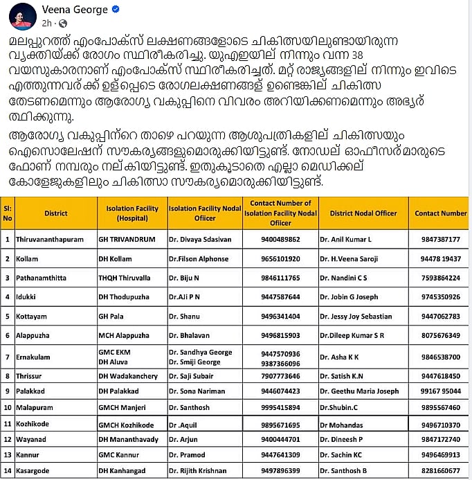இதுகுறித்து கேரள சுகாதாரத்துறை அமைச்சர் வீணா ஜார்ஜ் தெரிவித்துள்ளதாவது, வெளிநாடுகளிலிருந்து திரும்புவோர் தங்கள் உடலில் ஏதேனும் அறிகுறிகள் தென்பட்டால் சுகாதாரத்துறைக்கு தகவல் தெரிவிக்க கேட்டுக்கொள்கிறோம். இதற்காக சுகாதாரத்துறை அதிகாரிகளின் கைப்பேசி எண்களும் அறிவிக்கப்பட்டுள்ளன.