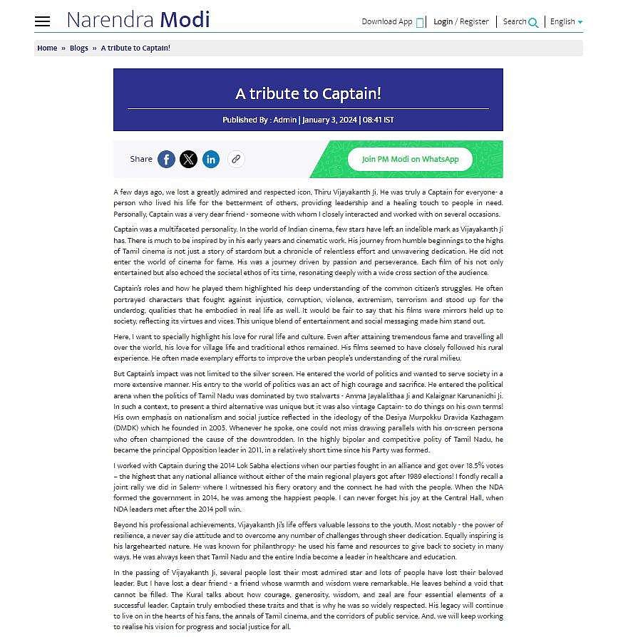 மறைந்த தேமுதிக தலைவர் விஜயகாந்த் குறித்து பிரதமர் நரேந்திர மோடி தனது வலைதளத்தில் உருக்கமான பதிவை வெளியிட்டுள்ளார்.