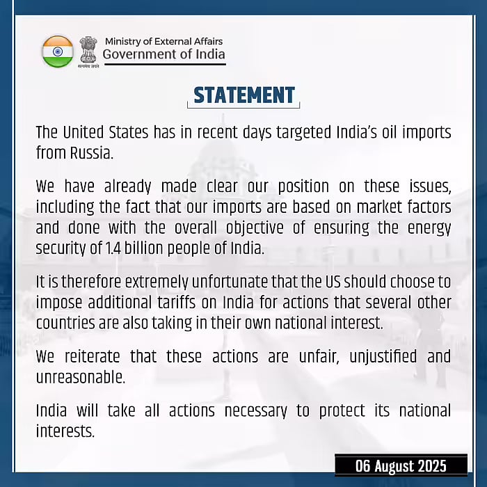 அமெரிக்காவின் வரி விதிப்பு நடவடிக்கை நியாயமற்றது என்பதை மீண்டும் வலியுறுத்துகிறோம் என்றும், ரஷிய எண்ணெய் இறக்குமதி விவகாரத்தில் ஏற்கெனவே தங்கள் நிலைப்பாட்டை விளக்கிவிட்டோம் எனவும் தெரிவித்துள்ளது.