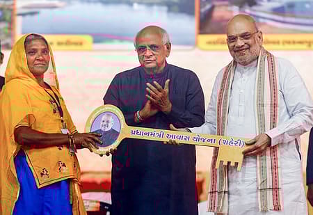 குஜராத் மாநிலம் அகமதாபாதில் ஞாயிற்றுக்கிழமை நடைபெற்ற நிகழ்ச்சியில் பிரதமா் வீட்டு வசதித் திட்டத்தின் கீழ் பயனாளிக்கு வீட்டுக்கான சாவி அளித்த மத்திய உள்துறை அமைச்சா் அமித் ஷா. உடன் மாநில முதல்வா் பூபேந்திர படேல்.