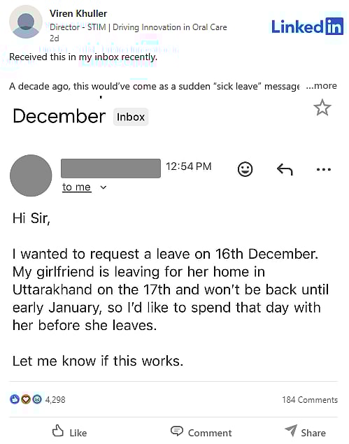 "சமீபத்தில் இந்த மெயில் எனக்கு வந்தது. பத்தாண்டுகளுக்கு முன்பு காலையில் ஒரு செய்தி வரும். உடல்நிலை சரியில்லை என்று ஊழியர்கள் விடுப்பு கேட்பார்கள். ஆனால் இன்று ஒரு வெளிப்படையான விடுப்பு கோரிக்கை. காலங்கள் மாறுகின்றன.." என்று பதிவிட்டு ஊழியர் அனுப்பிய அந்த இமெயிலையும் பகிர்ந்துள்ளார்.
