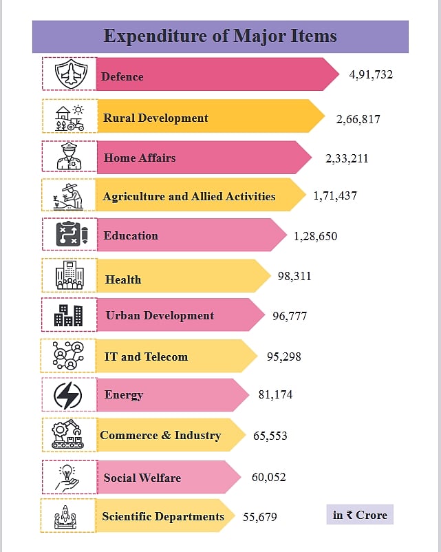 பிறகு உள்துறைக்கு ரூ.2.33 லட்சம் கோடியும் ஊரக வளர்ச்சித் துறைக்கு ரூ.2.66 கோடியும், நகர்ப்புற வளர்ச்சித் துறைக்கு ரூ.69,777 கோடியும் செலவிடப்படுவதாகத் தெரிவித்துள்ளது. சமூக நலன் துறைக்கு ரூ.60,052 கோடி ஒதுக்கப்பட்டுள்ளது.