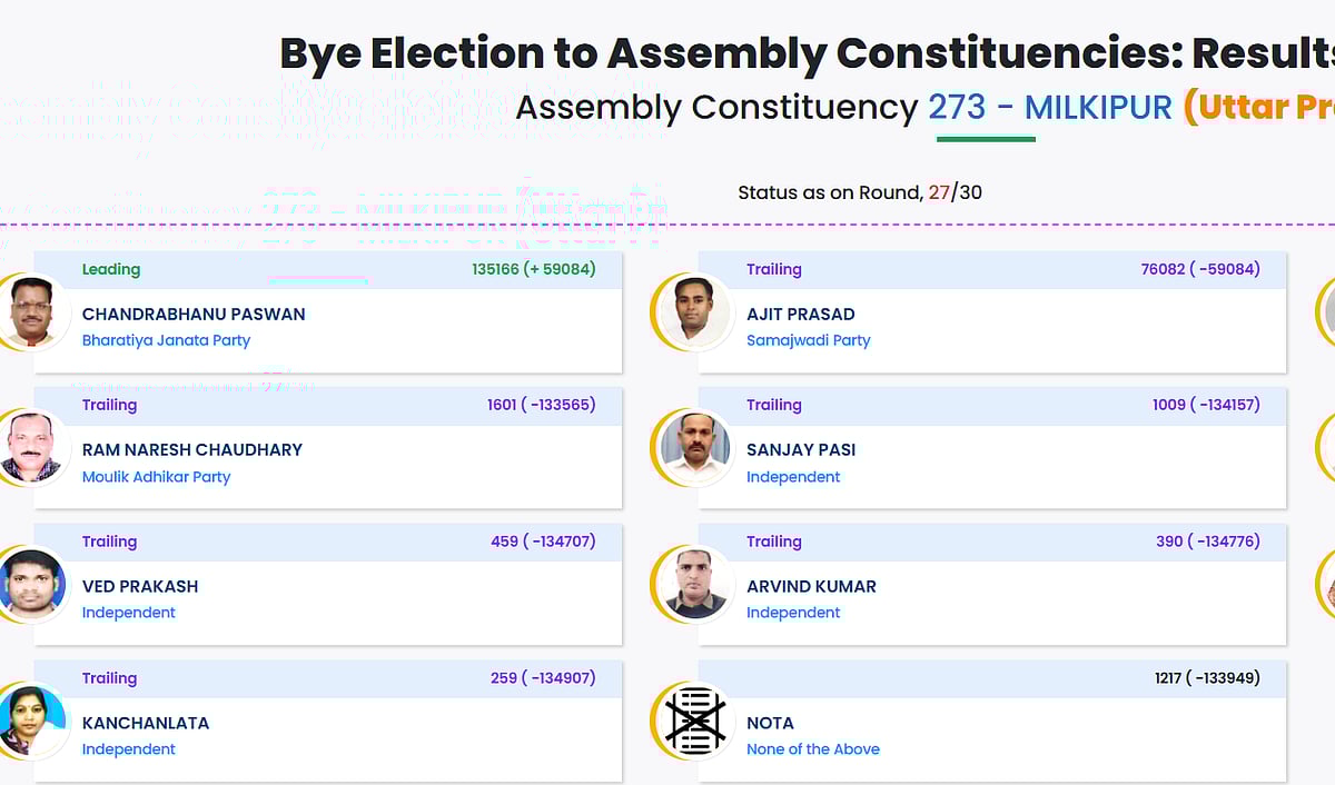 உத்தரப் பிரதேசத்தில் மில்கிபூர் தொகுதி இடைத்தேர்தலில் பாஜக வேட்பாளர் பெருவாரியான வாக்குகள் வித்தியாசத்தில் முன்னிலை பெற்று வருகிறார்.