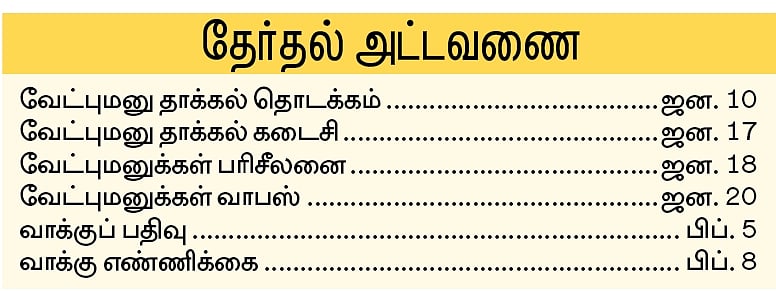 வேட்புமனு தாக்கல் ஜன. 10-ஆம் தேதி தொடங்குகிறது. வேட்பு மனுக்களைத் தாக்கல் செய்வதற்கான கடைசித் தேதி ஜன. 17. வேட்புமனுக்கள் பரிசீலனை ஜன. 18-ஆம் தேதி நடைபெறும். வேட்புமனுவை திரும்பப் பெற கடைசித் தேதி ஜன. 20. வாக்குப் பதிவு பிப். 5-ஆம் தேதியும், வாக்கு எண்ணிக்கை பிப். 8-ஆம் தேதியும் நடைபெறும். தேர்தல் நடைமுறைகள் பிப்.10-க்கு முன் முடிவுக்கு வரும்.