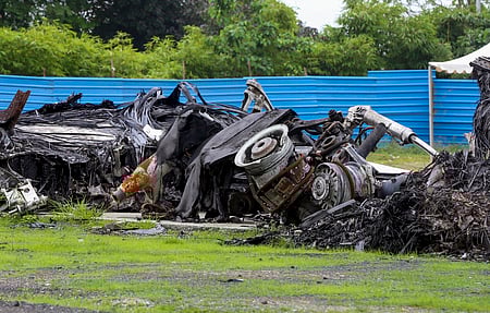 மாணவா் விடுதிக் கட்டடத்தில் விழுந்த விமானத்திந் பின் பகுதி.