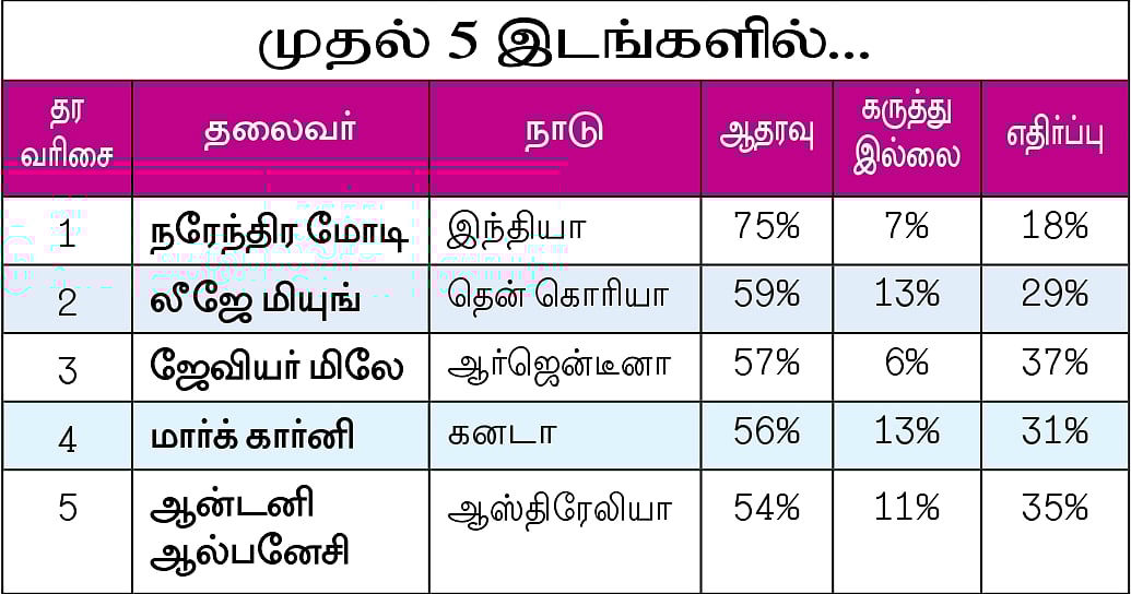 இதுதொடா்பான கருத்துக்கணிப்பில் பங்கேற்றவா்களில் 75 சதவீதம் போ் பிரதமா் மோடியின் தலைமையை நம்பகத்தன்மையுடன் ஏற்றுக்கொள்வதாக கருத்து தெரிவித்துள்ளனா். இந்தப் பட்டியலில் தென்கொரிய அதிபா் லீ ஜே மியுங் 59 சதவீத ஏற்புடன் 2-ஆம் இடத்தில் உள்ளாா்.