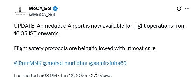 ஆமதாபாத் விமான நிலையம் மீண்டும் இயங்கத் தொடங்கியதாக மத்திய விமானப் போக்குவரத்து அமைச்சகம் அறிவித்துள்ளது.