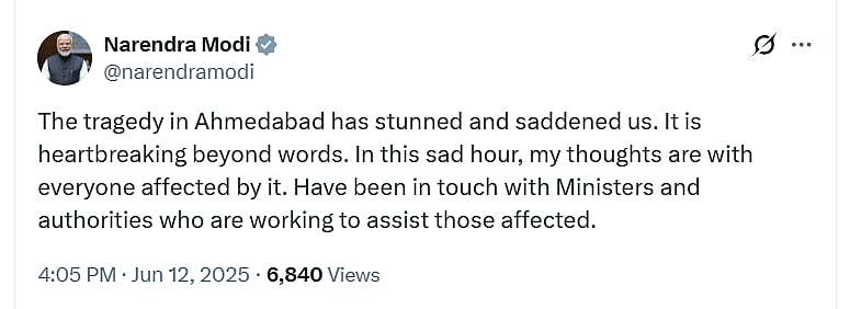 இந்நிலையில் பிரதமர் மோடி விபத்து பற்றி எக்ஸ் பக்கத்தில், "ஆமதாபாத்தில் நடந்த துயரச் சம்பவம் அதிர்ச்சிக்கு ஆளாக்கியுள்ளது. மிகவும் வருத்தமடையச் செய்துள்ளது. இந்த விபத்து, வார்த்தைகளால் விவரிக்க முடியாத அளவுக்கு வேதனை அளிக்கிறது.