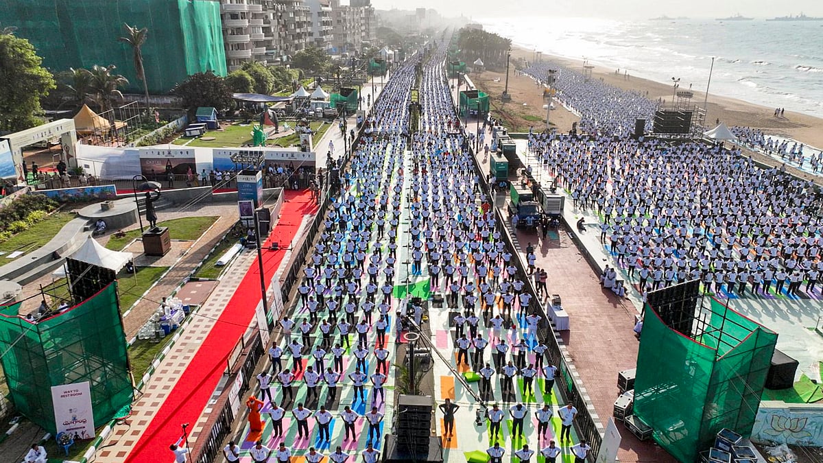 சா்வதேச யோகா தினம் இன்று(ஜூன் 21) கொண்டாடப்படுகிறது. இதையொட்டி, ஆந்திர பிரதேசத்திலுள்ள் விசாகப்பட்டினத்தில் பிரதமா் நரேந்திர மோடி தலைமையில் மிக பிரம்மாண்ட யோகா நிகழ்ச்சி நடைபெற்றது.