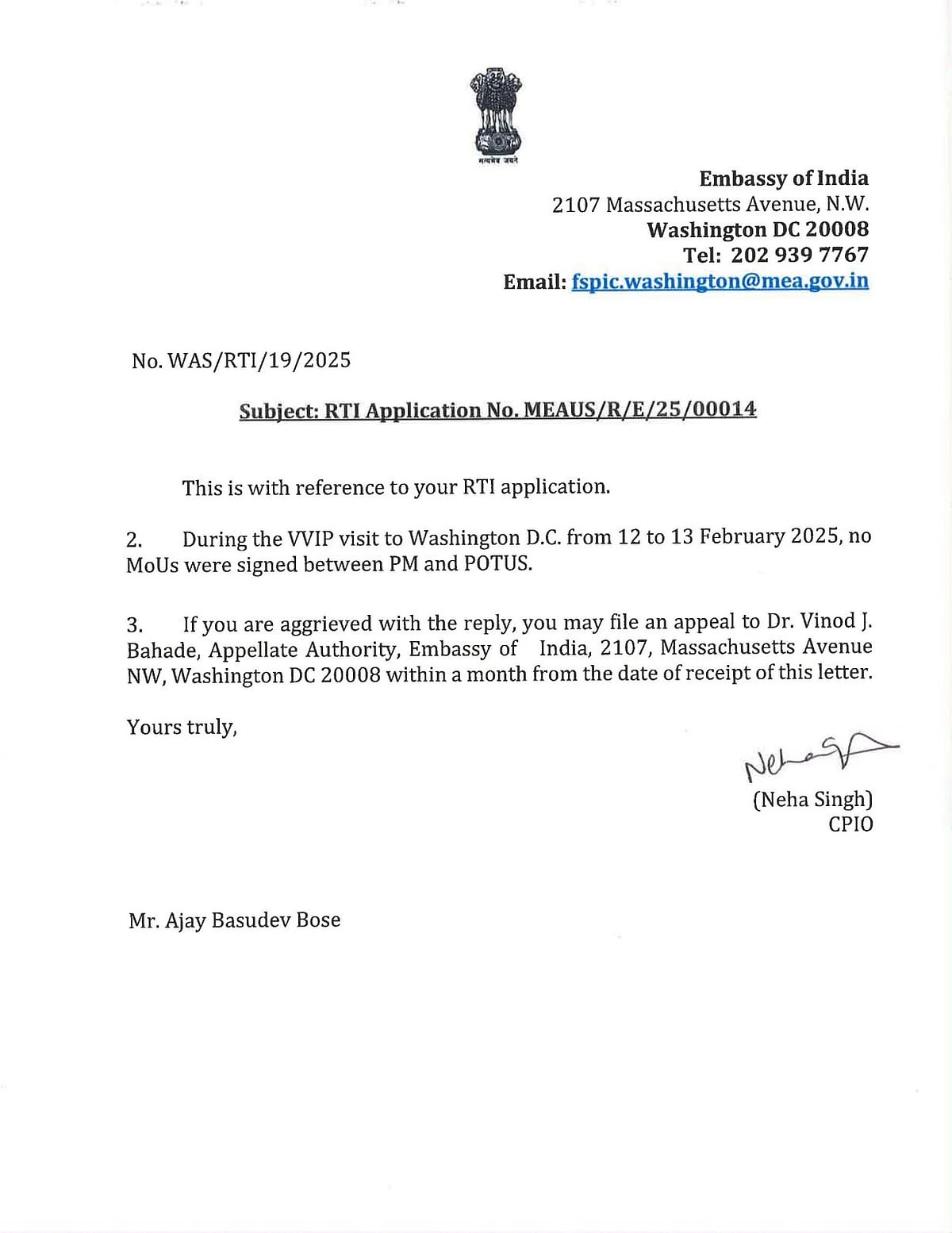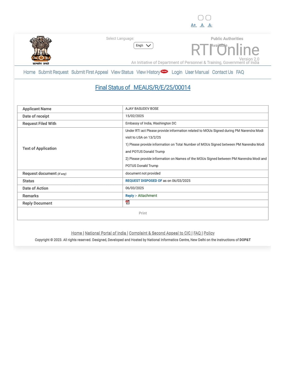 இந்த நிலையில், அமெரிக்கா சென்ற பிரதமர் மோடி மற்றும் அதிபர் டொனால்ட் டிரம்ப் இடையே எவ்வித புரிந்துணர்வு ஒப்பந்தங்கள் ஏதும் கையெழுத்தாகவில்லை என்று வாஷிங்டனில் உள்ள இந்திய தூதரகத்தில் பெறப்பட்ட தகவல் அறியும் உரிமைச் சட்டம்(RTI) பதில் அளித்துள்ளது.