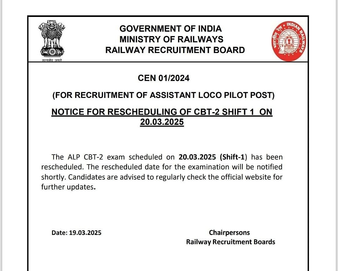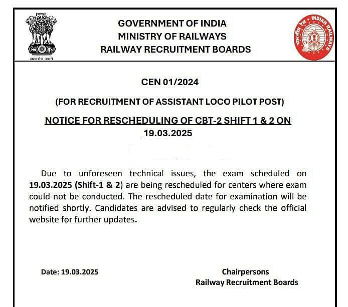 ரயில்வேயில் 18,799 உதவி லோகோ பைலட் பணியிடங்களுக்கு முதல்நிலை கணினித் தேர்வு கடந்த நவம்பர் மாத இறுதியில் நடைபெற்றது. இதன் முடிவுகள் வெளியான நிலையில் அதில் தேர்ச்சி பெற்றவர்களுக்கு மார்ச் 19, 20 தேதிகளில் இரண்டாம் நிலை கணினித் தேர்வு(CBT 2) நடைபெறவிருந்தது.