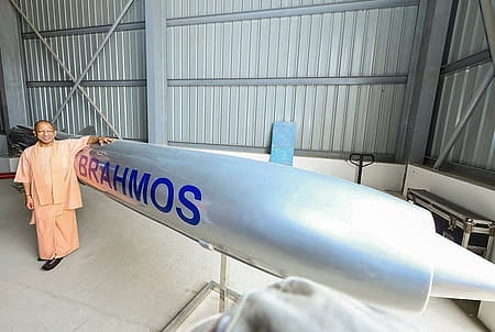 உ.பி. மாநிலம் லக்னௌவில் பிரமோஸ் சோதனை மையத்தை காணொலி வாயிலாகத் தொடங்கி வைத்த பாதுகாப்புத் துறை அமைச்சா் ராஜ்நாத் சிங்.
