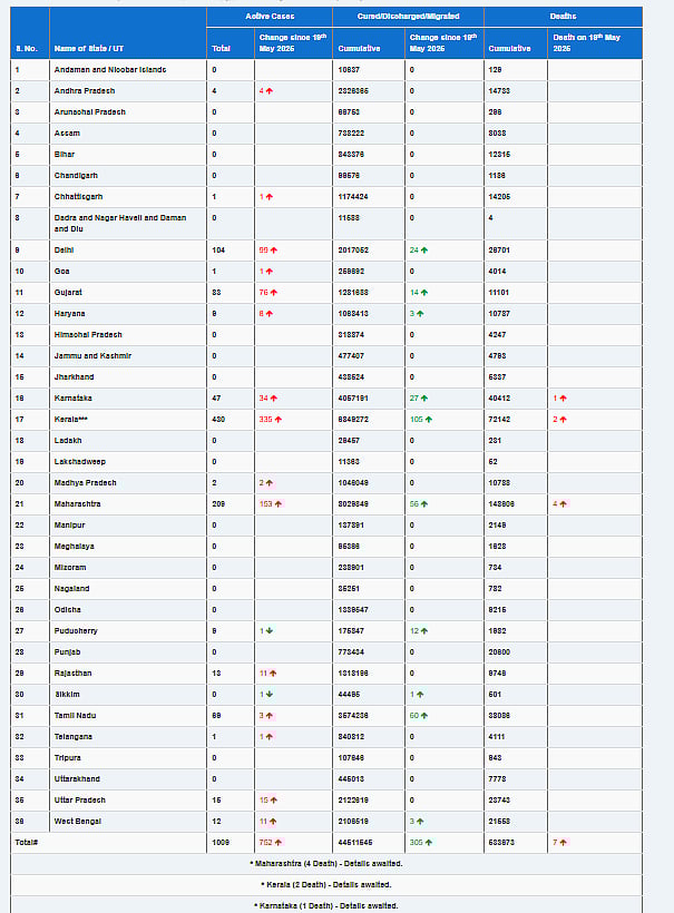 அதன்படி நாட்டில் தற்போது 1,009 பேருக்கு கரோனா உறுதி செய்யப்பட்டுள்ளது. அதிகபட்சமாக கேரளத்தில் 430 பேருக்கு உறுதியாகியுள்ளது.