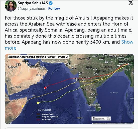 பருந்து இனத்தைச் சேர்ந்த அமுர் ஃபால்கன் என்ற பறவை, கடந்த 5 நாள்களில் இந்தியாவின் மணிப்பூரிலிரிந்து பறந்து சோமாலியாவுக்குச் சென்றுள்ளது.