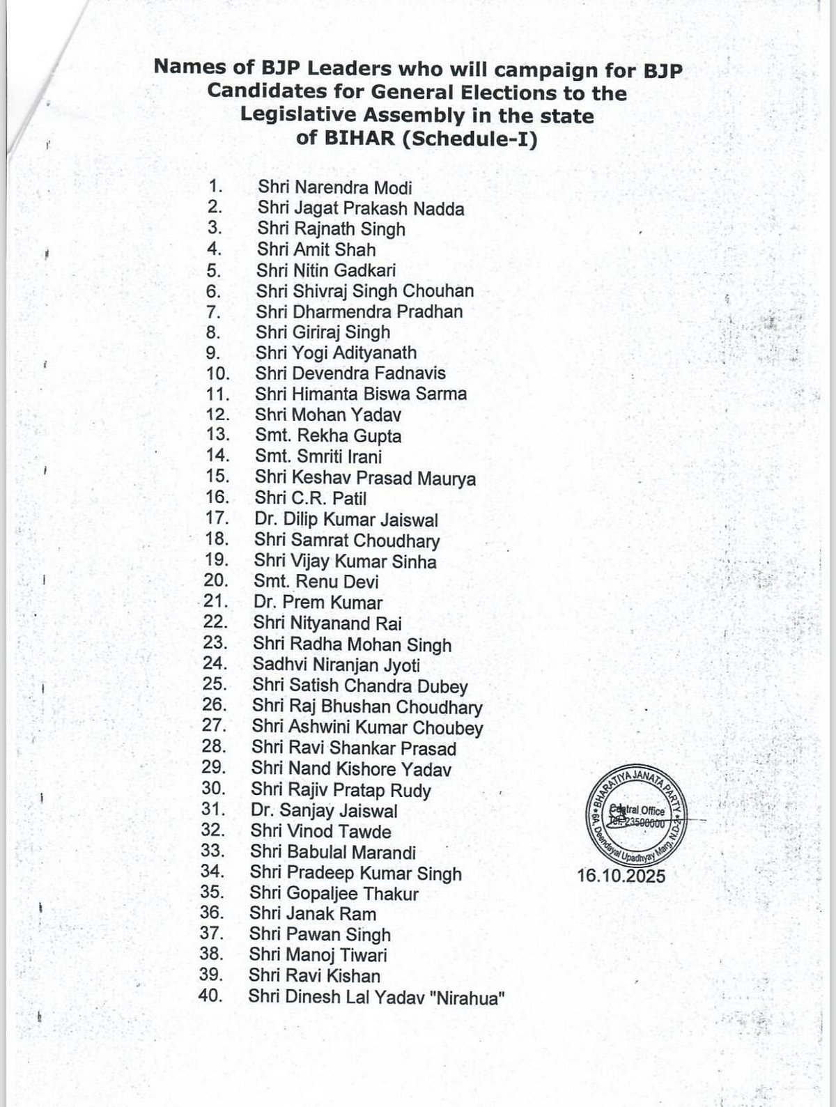 பிகார் பேரவைத் தேர்தலில் பாஜகவின் நட்சத்திரப் பேச்சாளர்கள் பட்டியல் வெளியிட்டுள்ளது. இதில், பிரதமர் நரேந்திர மோடி உள்பட 40 பேர் இந்தப் பட்டியலில் இடம்பெற்றுள்ளனர்.
