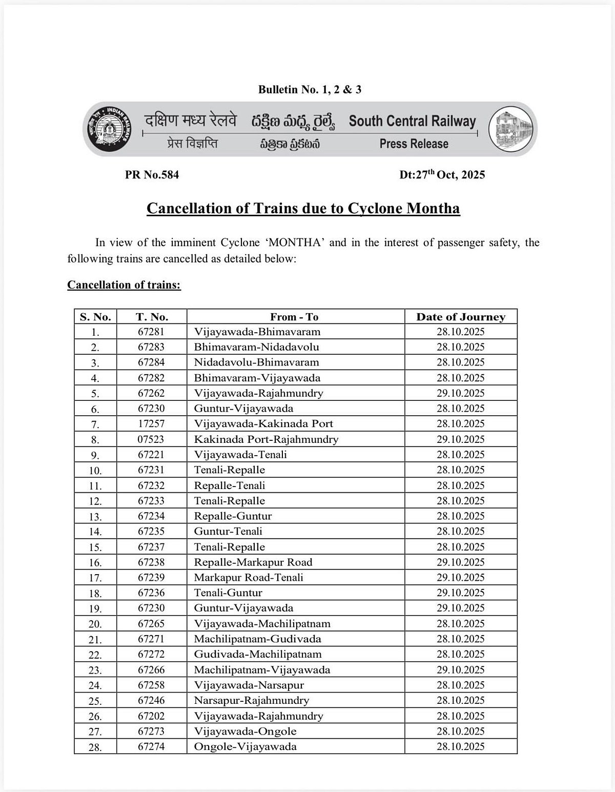 ‘மோந்தா’ புயல் அக். 28-இல் கரையைக் கடக்கவுள்ள நிலையில், பயணிகளின் பாதுகாப்பு கருதி தெற்கு மத்திய ரயில்வே மண்டலத்தில் அக். 28, 29 ஆகிய இரு நாள்கள் மொத்தம் 67 ரயில்கள் ரத்து செய்யப்பட்டுள்ளன. இது குறித்து தெற்கு மத்திய ரயில்வே வெளியிட்டுள்ள முழுவிவரம் பின்வருமாறு: