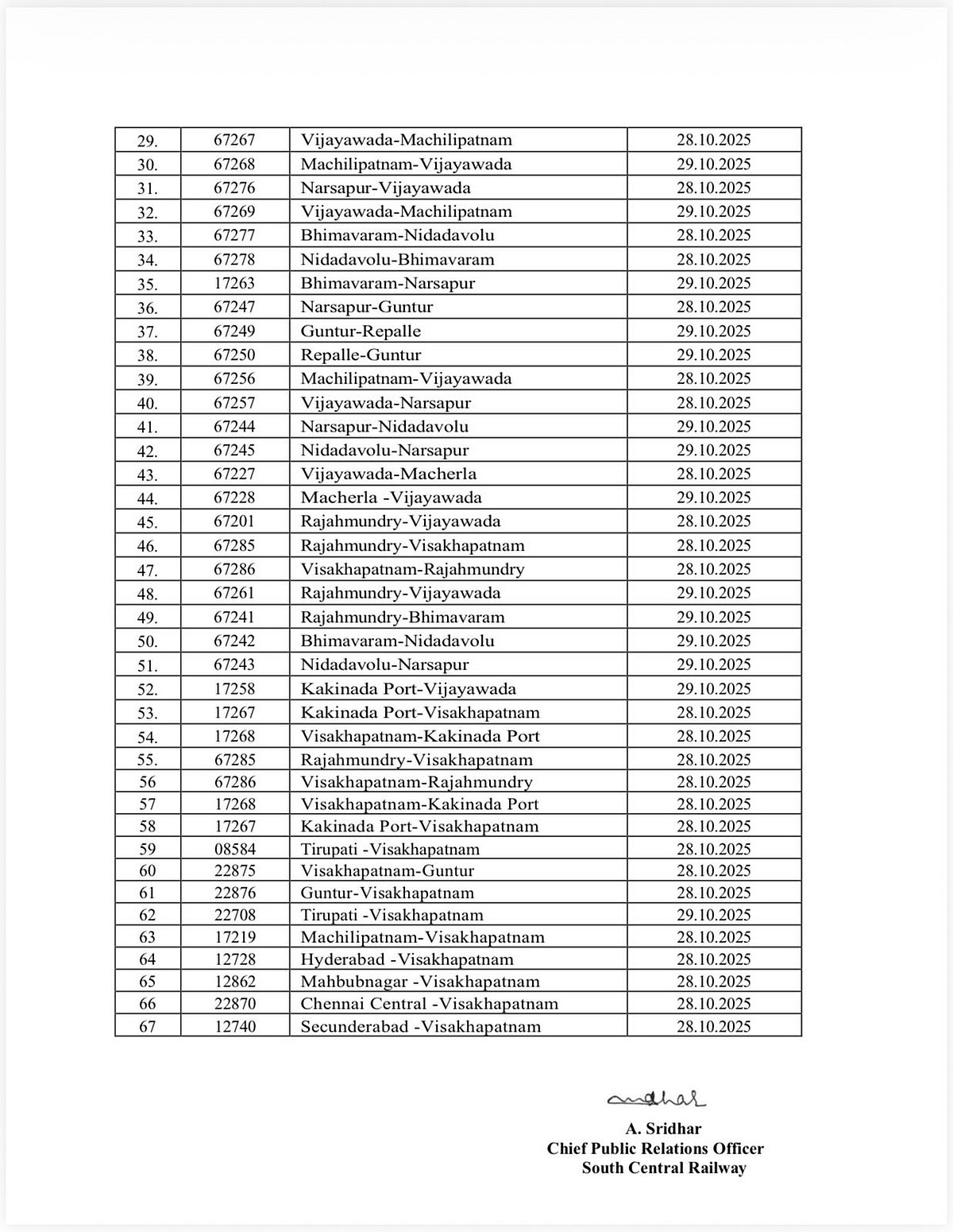 விஜயவாடா, பீமவரம், நிடாடவொலு, ராஜமுந்திரி, குண்டூர், காக்கிநாடா துறைமுகம், தெனாலி, ரெபல்லே, மார்கபூர் ரோடு, மச்சிலிப்பட்டினம், குடிவடா, நர்சபூர், ஓங்கோல், மச்சேர்லா, திருப்பதி, விசாகப்பட்டினம், ஹைதராபாத்,மஹ்பூப்நகர், செகந்திராபாத் ரயில்கள் அக். 28, 29 ரத்து செய்யப்பட்டிருப்பதுடன், சென்னை சென்ட்ரல் - விசாகப்பட்டினம் இடையேயான ரயில்(வண்டி.எண்: 22870) அக். 28 அன்று ஒருநாள் மட்டும் ரத்து செய்யப்பட்டுள்ளது.