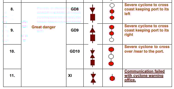 ஆனால், எட்டு முதல் 11 வரை புயல் எச்சரிக்கை கூண்டுகள் மிகுந்த அபாயம் இருப்பதைக் காட்டும். இந்த எண்களுங்கான புயல் எச்சரிக்கை கூண்டுகளில் கூம்பு வடிவம் கீழ்நோக்கி இருந்தால், புயல் சின்னம் துறைமுகத்தின் இடது பக்கமாக கரையைக் கடக்கும் என்றும், கூம்பு வடிவம் மேல் நோக்கி இருந்தால் வலது பக்கத்தில் கரையைக் கடக்கும் என்றும், உருளைக்கு மேலே இரண்டு கூம்பு வடிவங்கள் இணைக்கப்பட்டிருந்தால் துறைமுகத்தின் இரண்டு பக்கங்களிலும் புயல் கரையைடக் கடக்கும் என்றும் உருளை உருளை வடிவம் இன்றி வெறும் இரண்டு கூம்புகள் மட்டும் ஏற்றப்பட்டிருந்தால், புயல் எச்சரிக்கை தொடர்பான தகவல்கள், துறைமுகத்துக்குக் கிடைக்கவில்லை என்றும் பொருளாம்.