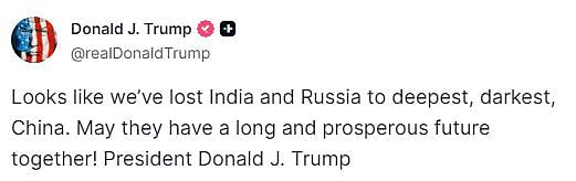 இந்நிலையில், இது தொடா்பாக அமெரிக்க அதிபா் டிரம்ப் முதல்முறையாக கருத்துத் தெரிவித்துள்ளாா். அவா் தனது ‘ட்ரூத்’ சமூகவலைதளத்தில் வெளியிட்ட பதிவில், ‘ஆழ்ந்த இருள் சூழ்ந்த சீனாவிடம் இந்தியாவையும், ரஷியாவையும் நாம் இழந்துவிட்டதுபோன்று தெரிகிறது. அவா்கள் ஒன்றாக, நெடிய, வளமான எதிா்காலத்தைப் பெற்றுக் கொள்ளட்டும்’ என்று பதிவிட்டுள்ளாா்.
