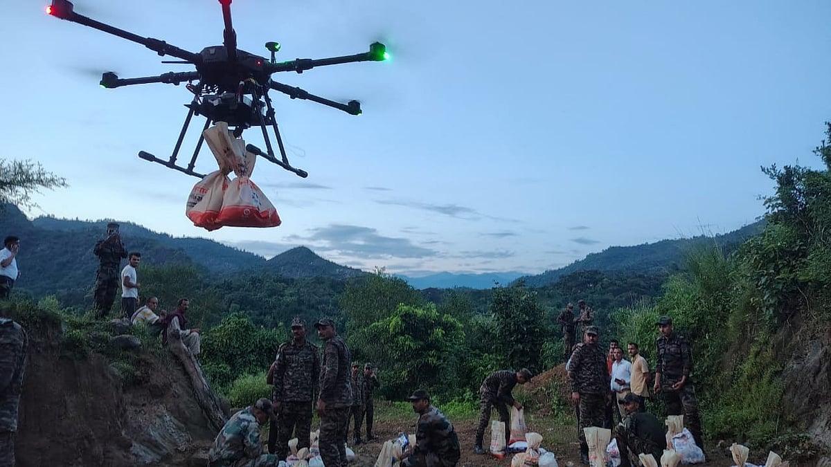 ஜம்மு - காஷ்மீரில் தொடர் கனமழை மற்றும் வெள்ளத்தில் பாதிக்கப்பட்ட கிராமங்களுக்கு ட்ரோன்கள் மூலம் உணவு, குடிநீர், மருந்துப் பொருள்களை ராணுவத்தினர் விநியோகம் செய்தனர்.