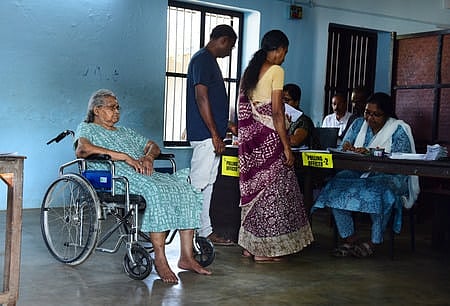 கேரளத்தில் சக்கர நாற்காலியில் சென்று வாக்கு செலுத்திய மூத்த வாக்காளர் ஒருவர் - Center-Center-Kochi