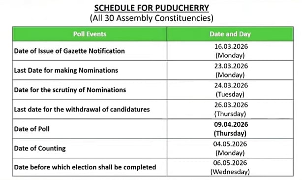 அசாம், கேரளம், புதுச்சேரியில் வேட்புமனு தாக்கல் மார்ச். 16-ஆம் தேதி தொடங்குகிறது. வேட்பு மனுக்களைத் தாக்கல் செய்வதற்கான கடைசித் தேதி மார்ச். 23. வேட்புமனுக்கள் பரிசீலனை மார்ச் 24-ஆம் தேதி நடைபெறும். வேட்புமனுவை திரும்பப் பெற கடைசித் தேதி மார்ச் 26. தேர்தல் நடைமுறைகள் மே 6-க்கு முன் முடிவுக்கு வரும் எனத் தெரிவிக்கப்பட்டுள்ளது.