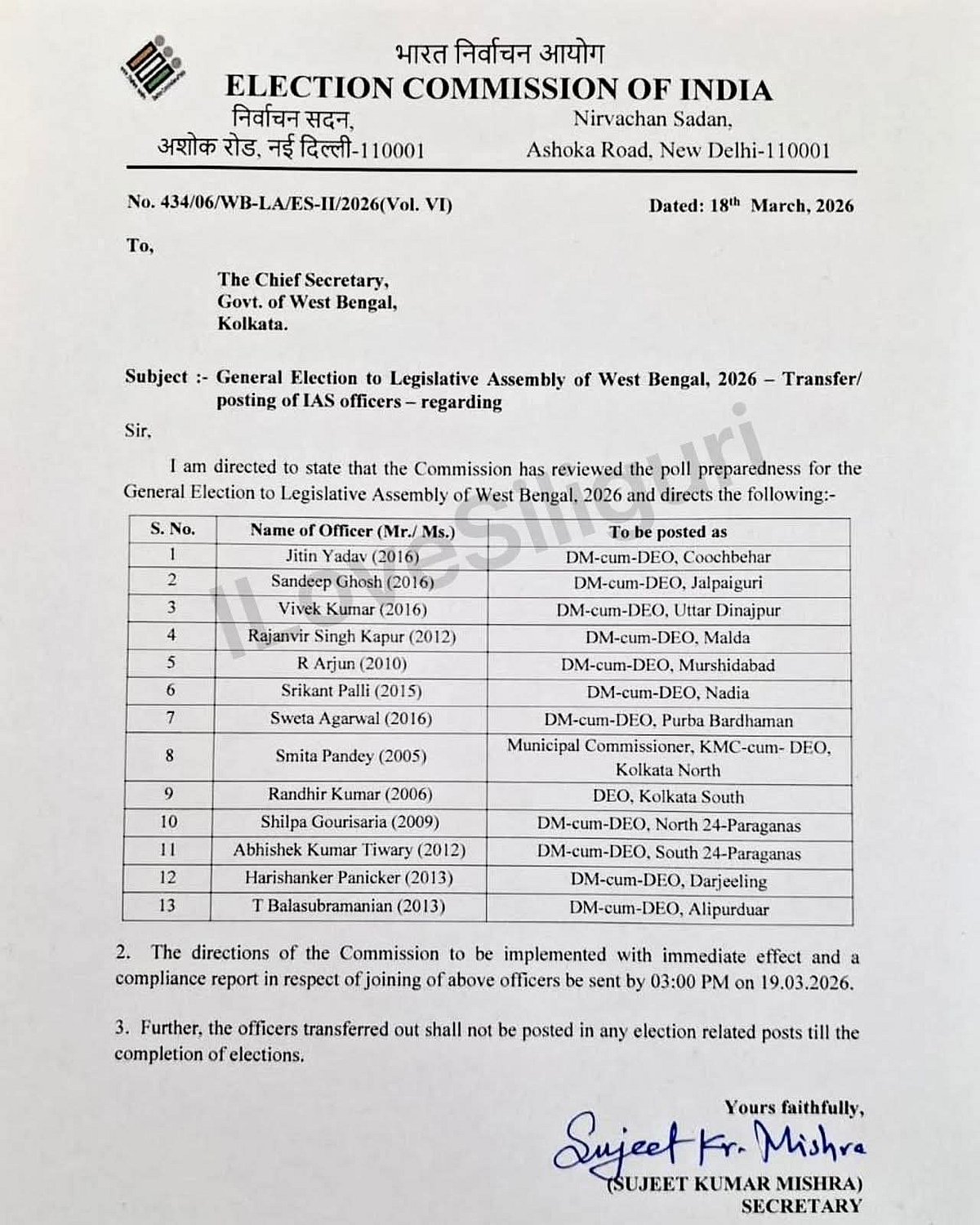 கூச்பெஹார், ஜல்பைகுரி, உத்தர் தினாஜ்பூர், மால்டா, முர்ஷிதாபாத், நதியா, புர்பா பர்தமான், கொல்கத்தா வடக்கு, கொல்கத்தா தெற்கு, வடக்கு 24 பர்கானாஸ், தெற்கு 24 பர்கானாஸ், டார்ஜிலிங், அலிபுர்துவார் ஆகிய மாவட்டங்களின் ஆட்சியர்கள் மாற்றப்பட்டுள்ளனர்.