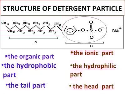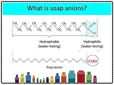 சோப் மூலக்கூறுகளின் ஒரு பக்கம், நெடிய எண்ணெய்யோடு ஒட்டக்கூடிய கொழுப்பு மூலக்கூறுச் சங்கிலி இருக்கும். இதனை நீரை வெறுக்கும் முனை (hydrophobic end) என்று அழைப்பார்கள். இன்னொரு பக்கம், நீரில் கரையக்கூடிய சோடியம், பொட்டாசியம் போன்ற உலோக அயனிகள் இருக்கும். இதனை நீரை விரும்பும் முனை (hydrophilic end) என்பார்கள். இந்த அமைப்புதான் சோப்பின் பலமே.
