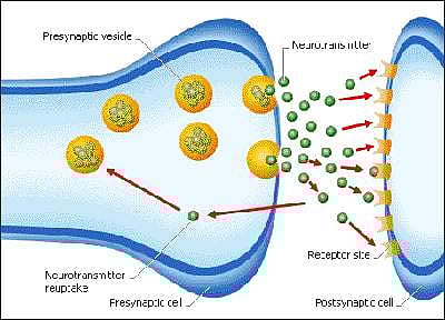 சமிக்ஞைகள் சில நேரம் கால்சியம், சோடியம் போன்ற அயனிகள் நகர்வால் மின்சாரமாகப் போகும். சில சமயம், வேதிப்பொருள்கள் நகர்வாலும் போகும். நியூரான்களில் தகவல்களைக் கடத்துவதால், அவற்றுக்கு நியூரோடிரான்ஸ்மிட்டர் என்று பெயர். அப்படி நகருகிற வேதிப்பொருள் எது என்பதைப் பொறுத்து விளைவு மாறுபடும். சில வேதிப்பொருள்கள் நரம்பை தூண்டும். சிலது, பொங்கல் சாப்பிட்டதுபோல் மந்தமாக இருக்கச் செய்யும். நரம்பைத் தூண்டும் வேதிப்பொருள்களுக்கு excitory neurotransmitter என்றும், மந்திக்கச் செய்யும் வேதிப் பொருள்களுக்கு inhibitory neurotransmitter என்றும் பெயர். இதைத்தவிர, வேதிப்பொருளின் உருவத்தை வைத்து அவற்றை மோனோஅமின்கள் (monoamines), அமினோ அமிலங்கள் (amino acids), பெப்டைடுகள் (peptides) மற்றும் பிற வகைகள் எனப் பிரிக்கிறார்கள்.