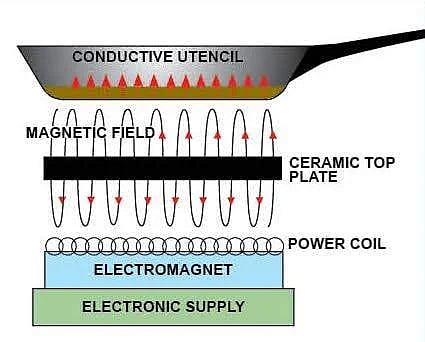 நம் இண்டக்‌ஷன் அடுப்பின் பளபளப்பான கருப்பு நிற செராமிக் மேற்புறத்துக்குக் கீழ் என்ன இருக்கிறது என்று பார்ப்போம். உள்ளே ஒரு குட்டி டிரான்ஸ்ஃபார்மர், வீட்டுக்கு வரும் மின்சாரத்தை அடுப்புக்குத் தேவையான அளவுக்கு மாற்றிக் கொடுக்கும். காந்தப் புலம் உருவாதற்காக, மெல்லிய தாமிரக் கம்பிகளை சுற்றிவைத்திருப்பார்கள். இதற்கு, நேர்மேல்தான் நாம் சமைக்கும் பாத்திரத்தை வைக்கிறோம். அடுப்பை ஆன் செய்தவுடன், இந்தக்‌ கம்பிச்சுருளில் மின்சாரம் பாய்ந்து, சில‌ சென்டிமீட்டர் உயரத்துக்கு, மாறிக்கொண்டே‌ இருக்கும் ஒருவித காந்தப்புலம் உருவாகும். இந்த உயரத்துக்குள் நம் பாத்திரத்தின் அடிப்பாகம் வந்துவிடும். மாறுகிற‌ காந்தப்புலத்தில் இருக்கும் அடிப்பாகத்தில், எட்டி கரன்ட்டுகள் உற்பத்தி ஆவதால், அடிப்பாகம் வெப்பமடையும். இந்த வெப்பம், உணவுக்குக்‌ கடத்தப்பட்டு சமையல் இனிதே நடைபெறும்.