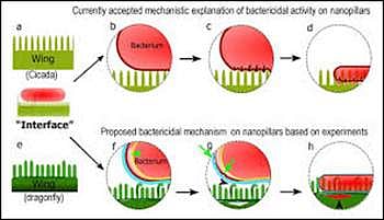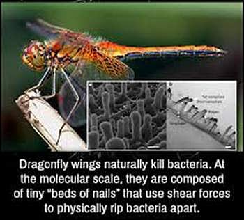 தட்டான், தும்பிப் பூச்சிகளின் இறகுகளில் இருக்கும் சில அமைப்புகள், பாக்டீரியாக்களை கழுவேற்றம் செய்கின்றனவாம். அவற்றின் இறகுகளின் பரப்பில் குச்சி குச்சியாய் அமைப்புகள் இருக்கின்றன. அவற்றை Nano Pillars என்று அழைக்கிறார்கள். இந்த அமைப்புகளால் அவற்றுக்கு இரண்டு நன்மைகள்.