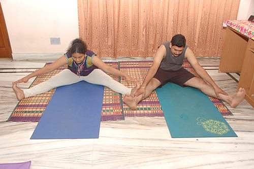 விரிப்பின் மீது அமர்ந்து, இரண்டு கால்களையும் அகலமாக விலக்கிவைக்கவும்.