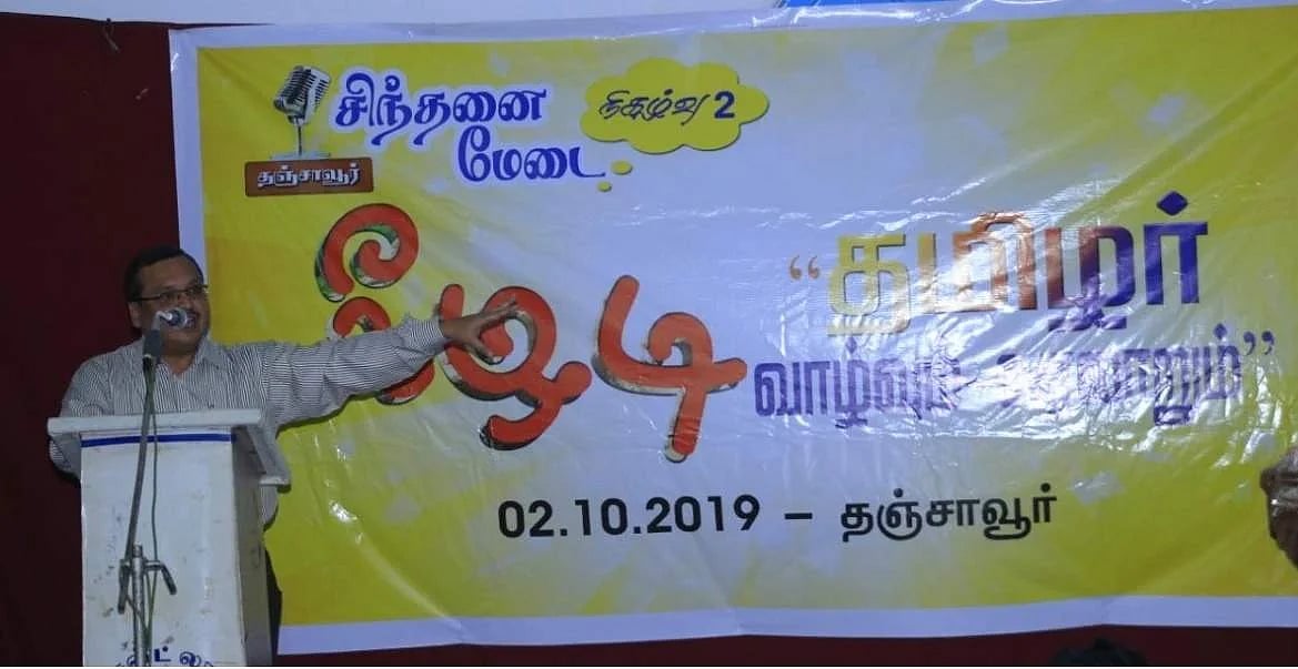 தஞ்சாவூரில் சிந்தனை மேடை என்ற அமைப்பு சார்பில் நடந்த கருத்தரங்கில் பங்கேற்று 'கீழடி - தமிழர் வாழ்வும் வரலாறும்' என்ற தலைப்பில் பேசினார் அமர்நாத் ராமகிருஷ்ணா.