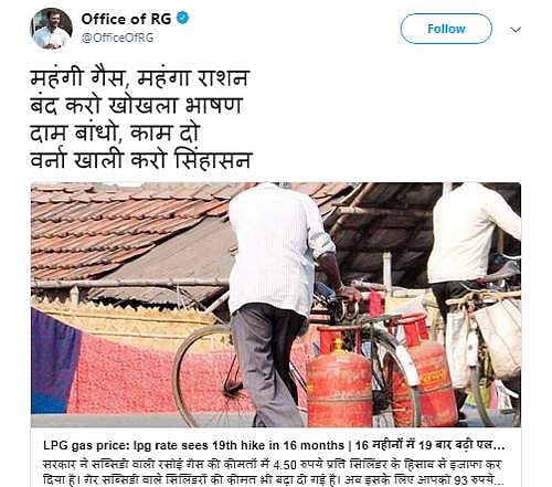 இந்நிலையில், கடந்த 16 மாதங்களில் மோடி அரசு சமையல் எரிவாயு விலையை 19-வது முறையாக உயர்த்தியுள்ளது என்ற செய்தியை கையில் எடுத்து டுவிட்டரில் தாக்குதல் நடத்தியுள்ளார் ராகுல்.