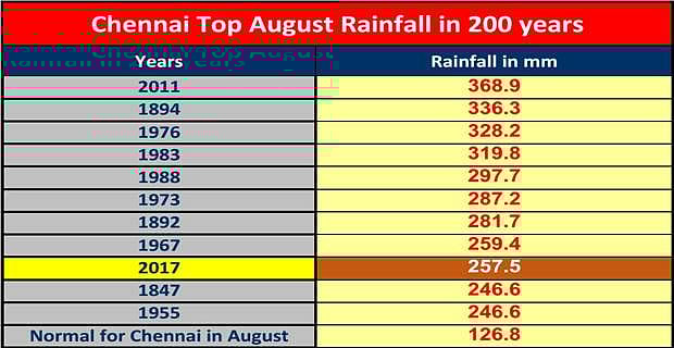 கடந்த 200 ஆண்டுகளில், சென்னைக்கு 9-வது மழை மிகுந்த ஆகஸ்ட் மாதமும் இதுதான். ஆசியாவிலே பழமையான வானிலை ஆய்வு மையம் ஒன்று. சென்னை நகரத்திற்கு 1813-ல் இருந்து 200 ஆண்டுகளுக்கு மழைப்பொழிவு புள்ளிவிவரங்கள் கிடைக்கின்றன. சென்னையின் அதிகபட்ச மழை பெற்ற ஆகஸ்ட் மாதம் என்ற சாதனையை, 2011-ஆம் ஆண்டு முறியடித்தது. அதற்கு பிறகு 2011 ஆண்டைவிட அதிக மழைகொண்ட ஆகஸ்ட் மாதம் இதுவரை வரவில்லை இருந்தாலும் 2017 ஆகஸ்ட் சென்னைக்கு அதிக மழை பெற்றதில் 9 ஆவது இடம். கடந்த 200 வருடங்களில். செங்குன்றம் (Redhills) தனது அதிக பட்ச மழையாக 425 மில்லிமீட்டர் அளவுக்கு இந்த 2017 ஆகஸ்ட் இல் பதிவு செய்துள்ளது என்று கூறியுள்ளார்.