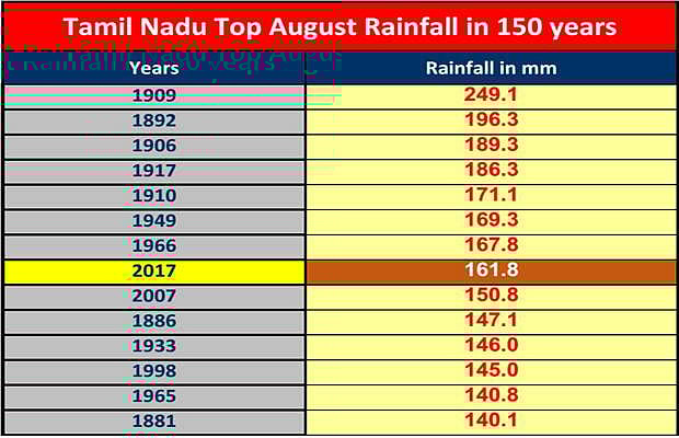 தமிழகத்தில் கடந்த 150 வருடங்களில் 8 ஆவது அதிக மழையை பெற்ற மாதம்தான் 2017 ஆகஸ்ட் மாதம் என்கிறார் தமிழ்நாடு வெதர்மேன்.