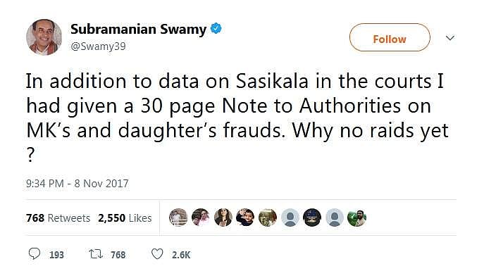 சசிகலா பற்றிய தகவல்கள் தவிர்த்து எம்.கே (கருணாநிதி), மகள் (கனிமொழி) மோசடிகள் தொடர்பான 30 பக்க ஆவணங்களை அதிகாரிகளிடம் அளித்திருந்தேன்.