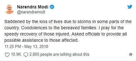 இதுதொடர்பாக மோடி ட்விட்டரில்,நாட்டின் சில மாநிலங்களில் புழுதி புயல் தாக்கி பலியானவர்கள் குடும்பத்துக்கு எனது ஆழ்ந்த இரங்கலை தெரிவித்துக் கொள்கிறேன். இதில் காயமடைந்தவர்கள் விரைவில் குணமடைய வேண்டும் என இறைவனிடம் வேண்டுகிறேன் என பதிவிட்டுள்ளார்.