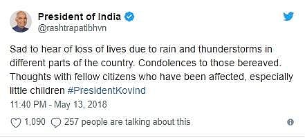 இதுகுறித்து குடியரசுத் தலைவர் ராம்நாத் கோவிந்த் தனது ட்விட்டரில், நாடு முழுவதும் மழை மற்றும் புழுதி புயலுக்கு பலர் பலியானது வருத்தம் அளிக்கிறது. இதில் பலியானவர்கள் குடும்பத்துக்கு எனது இரங்கலை தெரிவித்துக் கொள்கிறேன் என பதிவிட்டுள்ளார்.