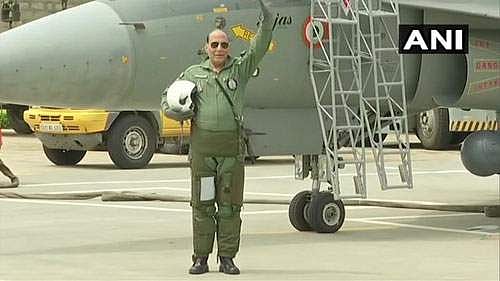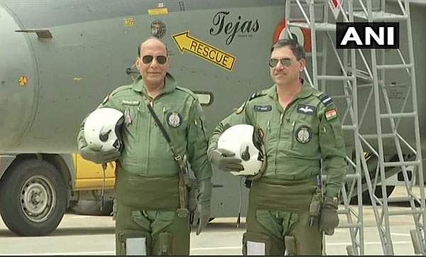 பின்னர் தேஜஸ் விமானத்தில் ஏறிய ராஜ்நாத் சிங் சுற்றியிருந்தவர்களை பார்த்து கைகளை அசைத்து பின்னர் விமானத்தில் பயணித்தார். தேஜஸ் போர் விமானத்தில் அவருடன் விமான படை துணைத் தளபதி என். திவாரியும் சென்றார்.
