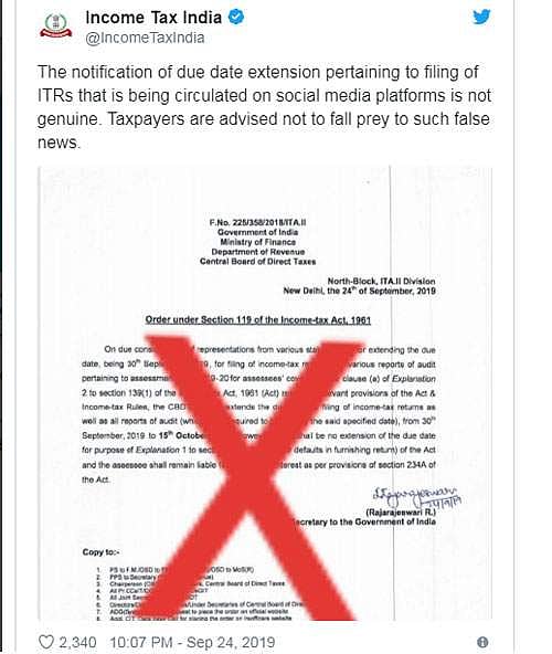 ஆனால், வருமான வரி தாக்கல் செய்யவதற்கு அக்டோபர் 15 வரை நீட்டிக்க முடிவு செய்துள்ளதாக ஒரு போலி அறிவிப்பு சமூக ஊடகங்களில் பரவி வருகிறது. இது உண்மையானதல்ல. வரி செலுத்துவோர் இதுபோன்ற தவறான செய்திகளுக்கு இரையாக வேண்டாம் என்று அறிவுறுத்தப்படுகிறார்கள்" என்று வருமான வரித்துறை பதிவிட்டுள்ள ஒரு டிவிட்டில் தெரிவித்துள்ளது.