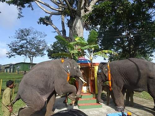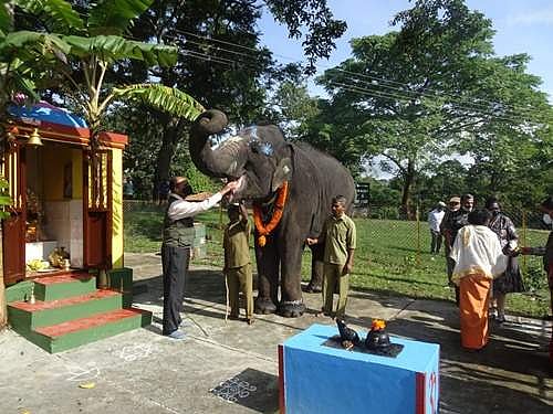 முதுமலை புலிகள் காப்பகத்தில் நடைபெற்ற விநாயகர் சதுர்த்தி விழாவில் யானைகள் மணியாட்டி, பூஜை செய்து மண்டியிட்டு வணங்கின.