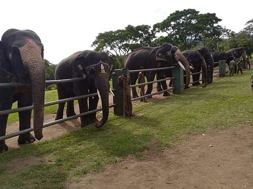 பூஜையைத் தொடர்ந்து முகாமில் யானைகள் அணிவகுத்து நின்றன. யானைகளுக்கு இனிப்பு மற்றும் சிறப்பு உணவுகள் வழங்கப்பட்டன.